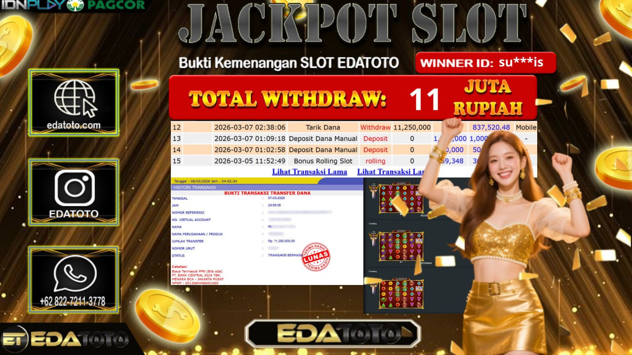 Selamat Kepada Pemilik user ID :su***is Hari/Tanggal : Sabtu/ 07 MARET 2026 Jackpot : Rp, 11.000.000 JT Withdraw : 11,250,000 . . .
