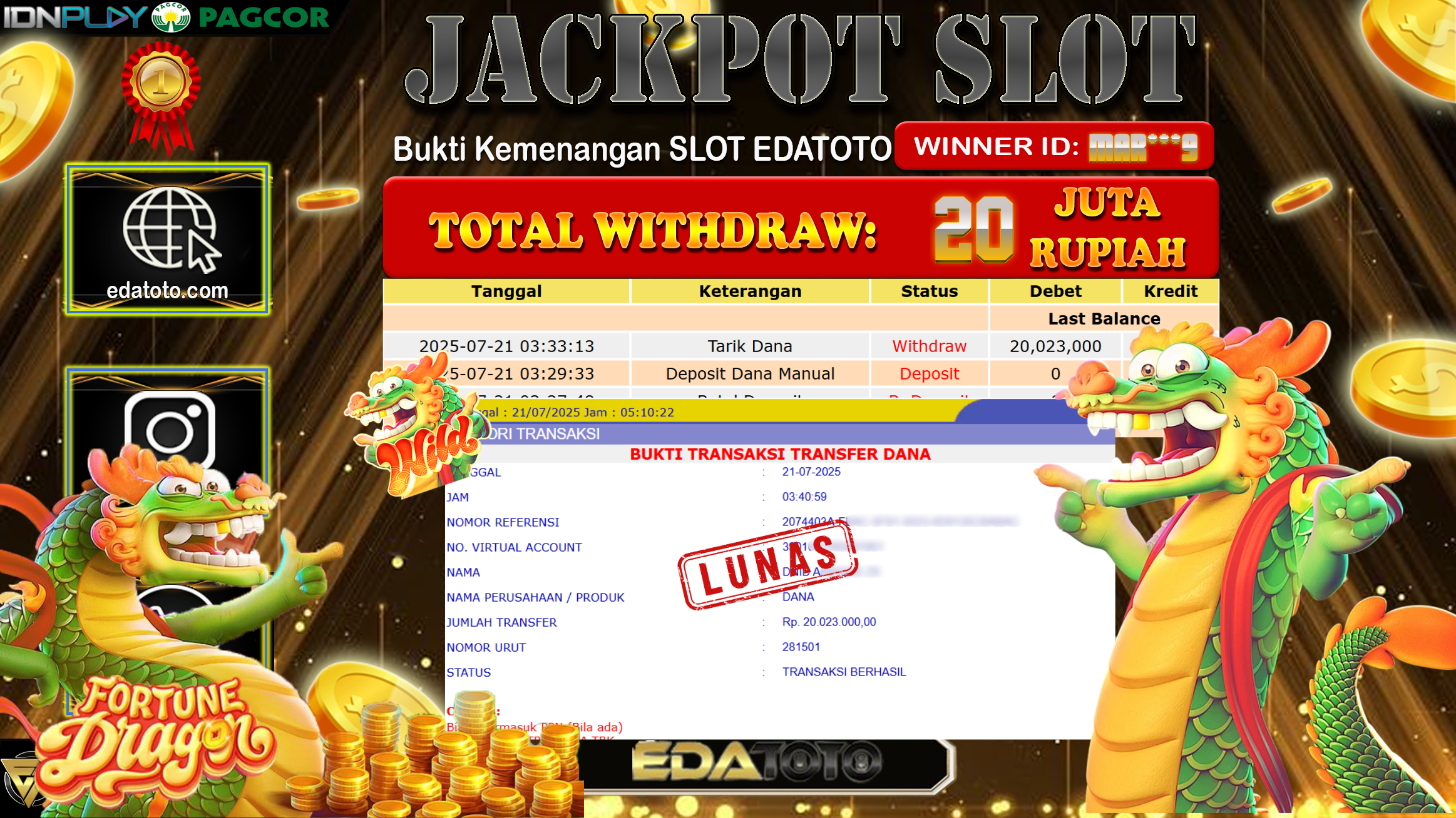 Selamat Kepada Pemilik user ID : MAR**9 Hari/Tanggal : Senin/ 21, Juli 2025 Jackpot : Rp. 20.023.000 JT Permainan : . . .
