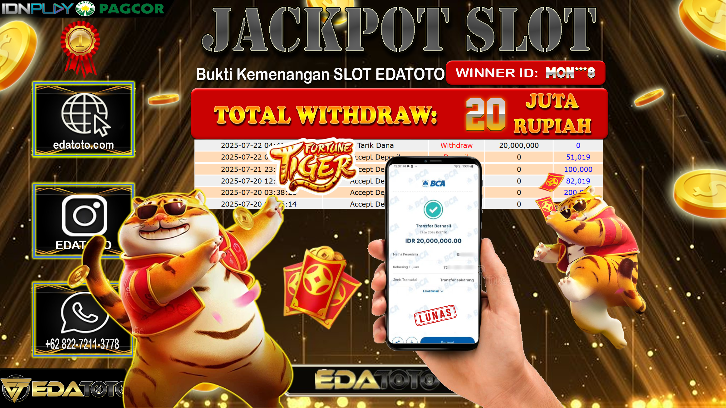 Selamat Kepada Pemilik user ID : MON**8 Hari/Tanggal : Selasa/ 22, Juli 2025 Jackpot : Rp. 20.000.000 JT Permainan : Fortune . . .