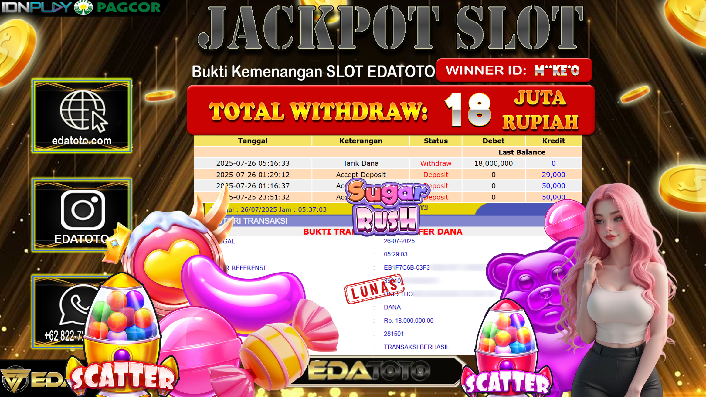 Selamat Kepada Pemilik user ID : M**KE*0 Hari/Tanggal : Sabtu/ 26, Juli 2025 Jackpot : Rp. 18.000.000 JT Permainan : Sugar . . .