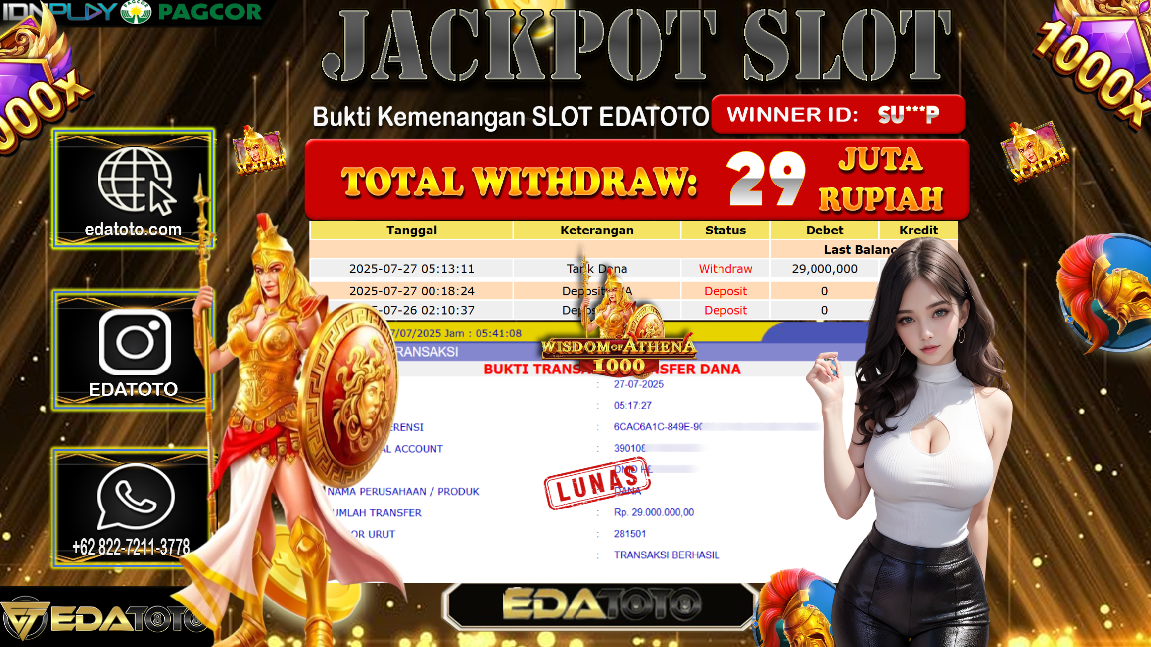 Selamat Kepada Pemilik user ID : SU***P Hari/Tanggal : Minggu/ 27, Juli 2025 Jackpot : Rp. 29.000.000 JT Permainan : Wisdom . . .