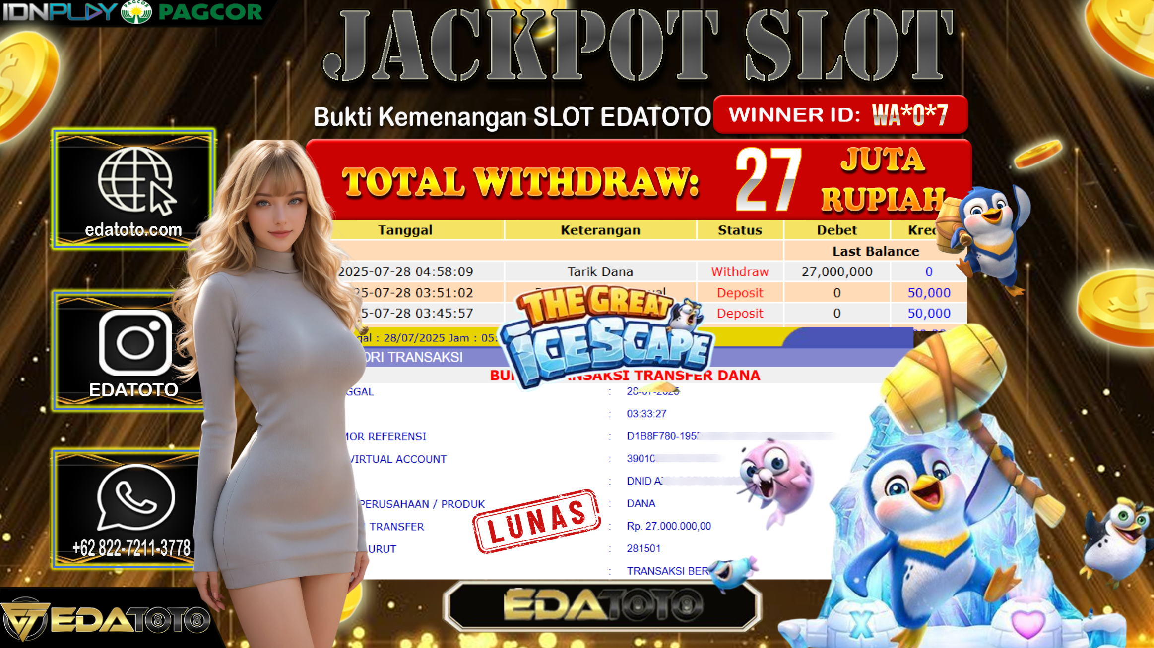 Selamat Kepada Pemilik user ID : WA*O*7 Hari/Tanggal : Senin/ 28, Juli 2025 Jackpot : Rp. 27.000.000 JT Permainan : The . . .