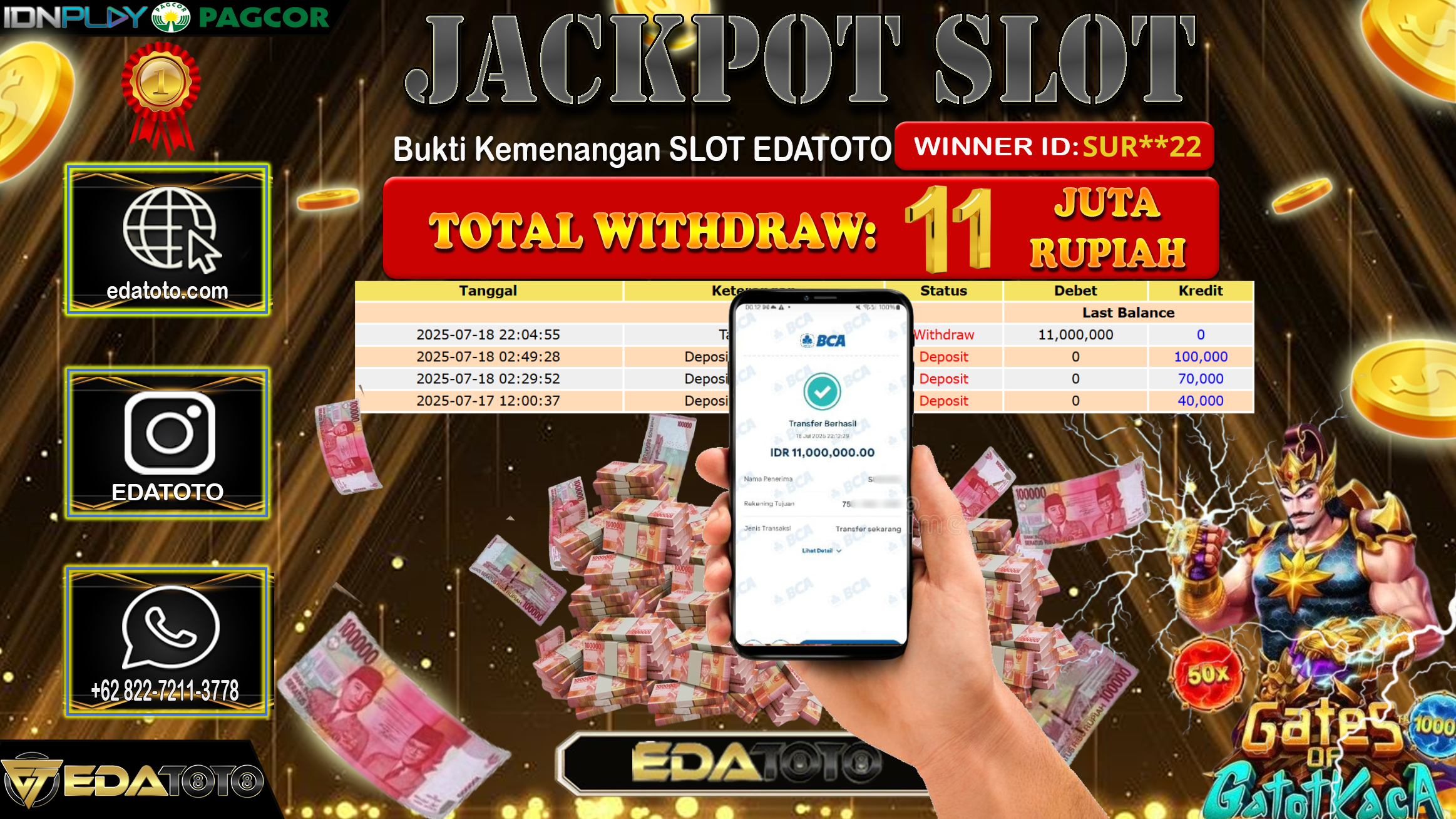 Selamat Kepada Pemilik user ID : SUR**22 Hari/Tanggal : Sabtu/ 19, Juli 2025 Jackpot : Rp. 11.000.000 JT Permainan : Gates . . .