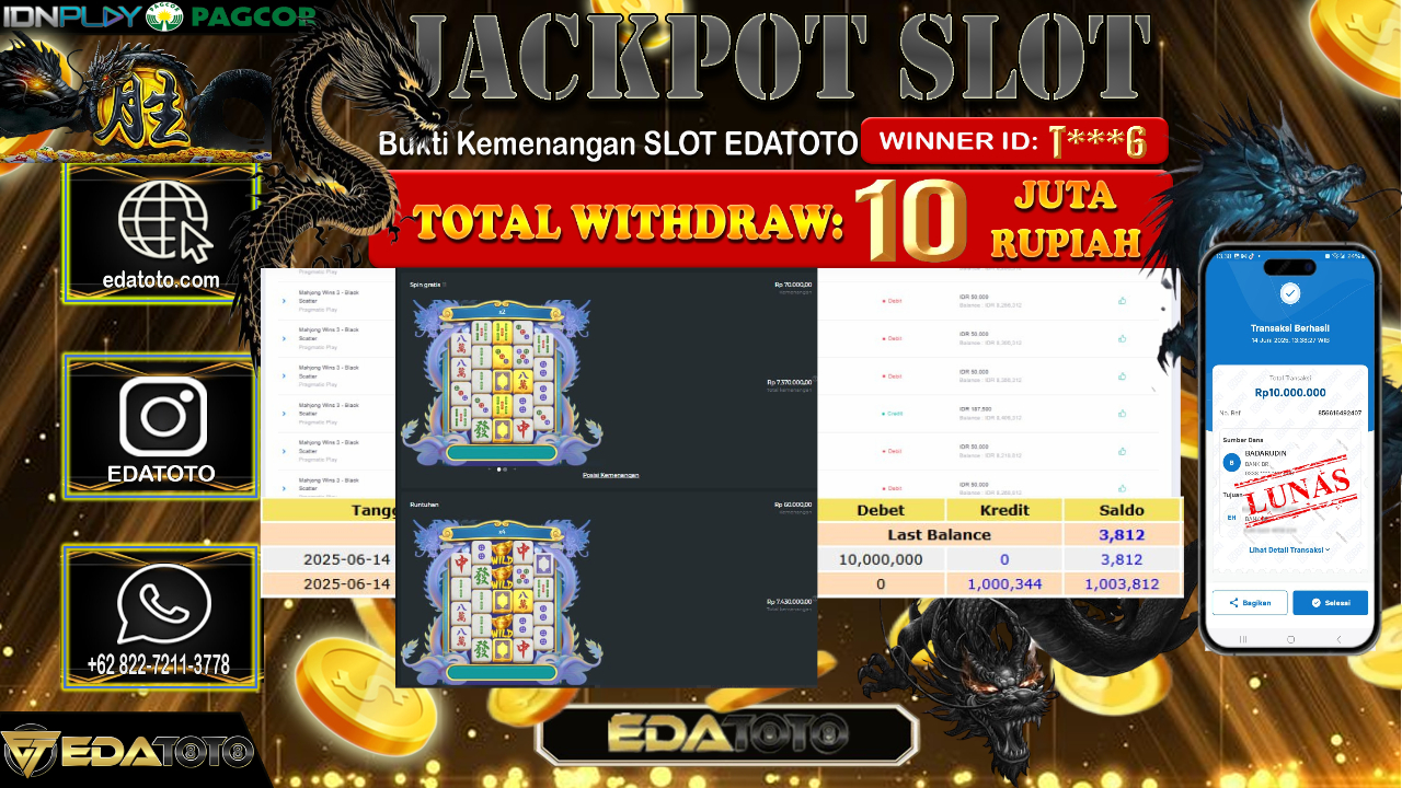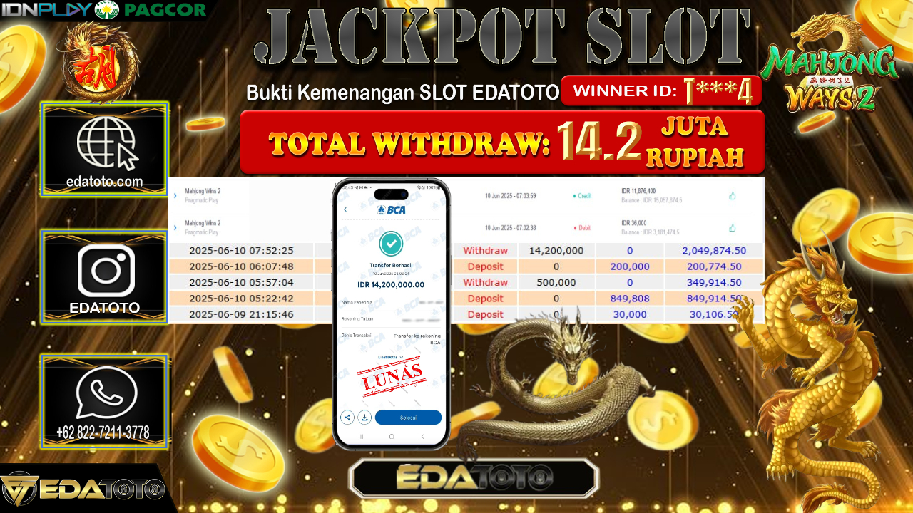 Selamat Kepada Pemilik user ID : T***4 Hari/Tanggal : Selasa/ 10, Juni 2025 Jackpot : Rp. 14.200.000 JT Permainan : Mahjong . . .