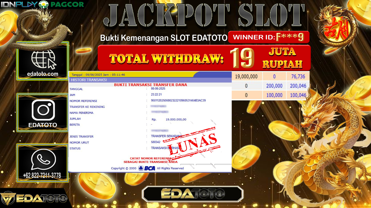Selamat Kepada Pemilik user ID : F***9 Hari/Tanggal : Senin/ 09, Juni 2025 Jackpot : Rp. 19.000.000 JT Permainan : Mahjong . . .