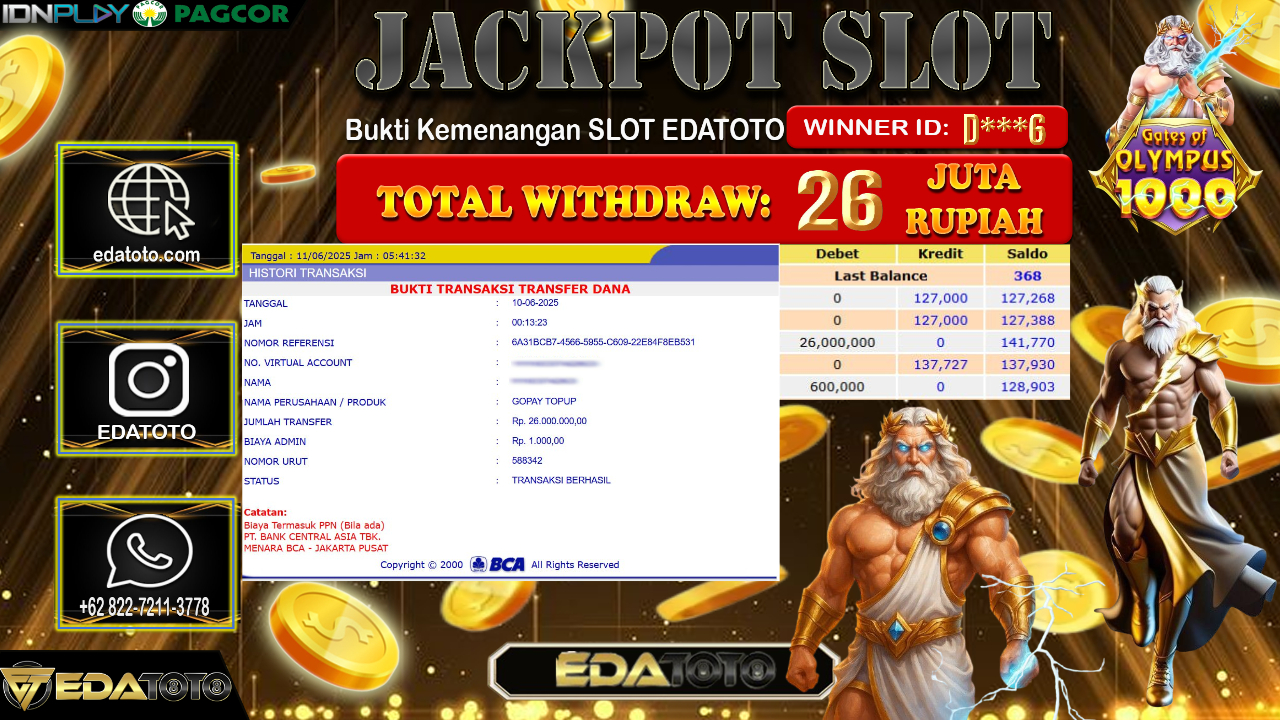 Selamat Kepada Pemilik user ID : D***6 Hari/Tanggal : Rabu/ 11, Juni 2025 Jackpot : Rp. 26.000.000 JT Permainan : . . .