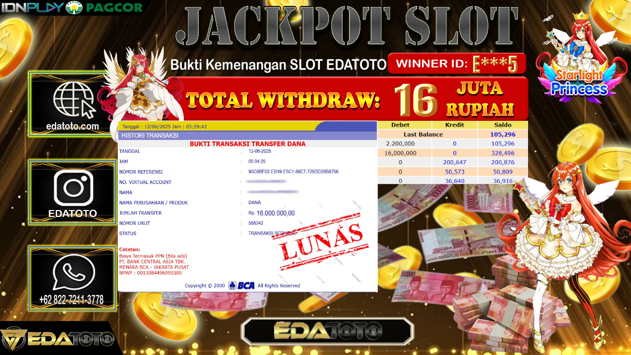 Selamat Kepada Pemilik user ID : E***5 Hari/Tanggal : Kamis/ 12, Juni 2025 Jackpot : Rp. 16.000.000 JT Permainan : . . .