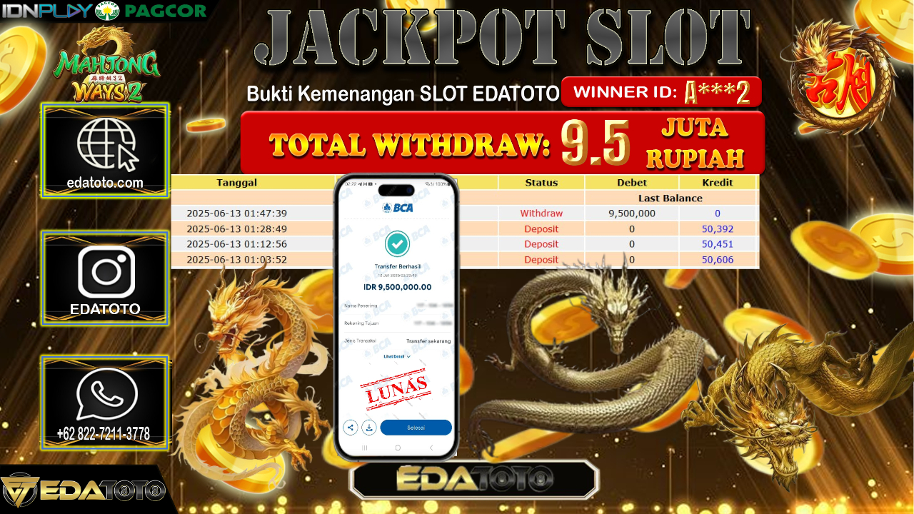 Selamat Kepada Pemilik user ID : A***2 Hari/Tanggal : Jum’at/ 13, Juni 2025 Jackpot : Rp. 9.500.000 JT Permainan : . . .