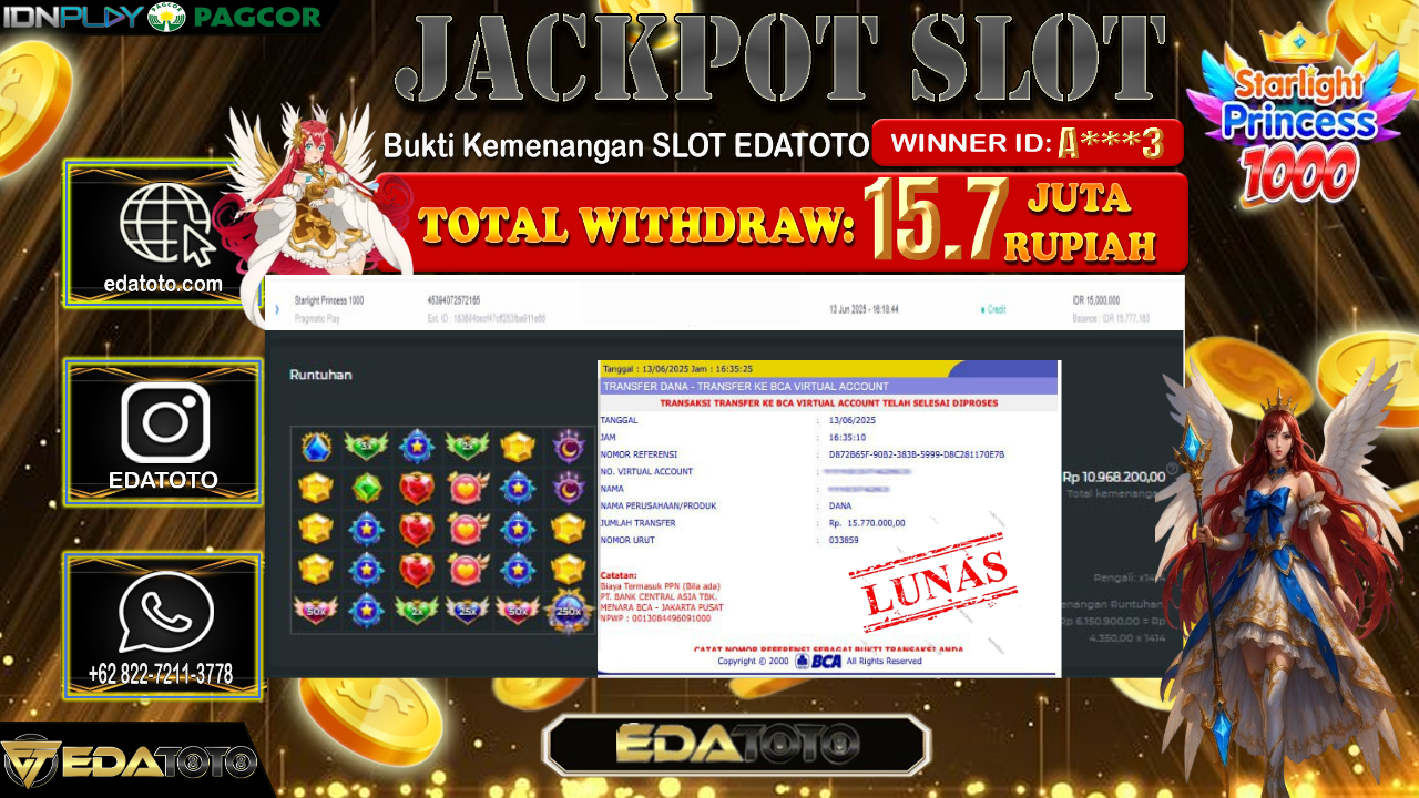 Selamat Kepada Pemilik user ID : A***3 Hari/Tanggal : Sabtu/ 14, Juni 2025 Jackpot : Rp. 15.770.000 JT Permainan : . . .