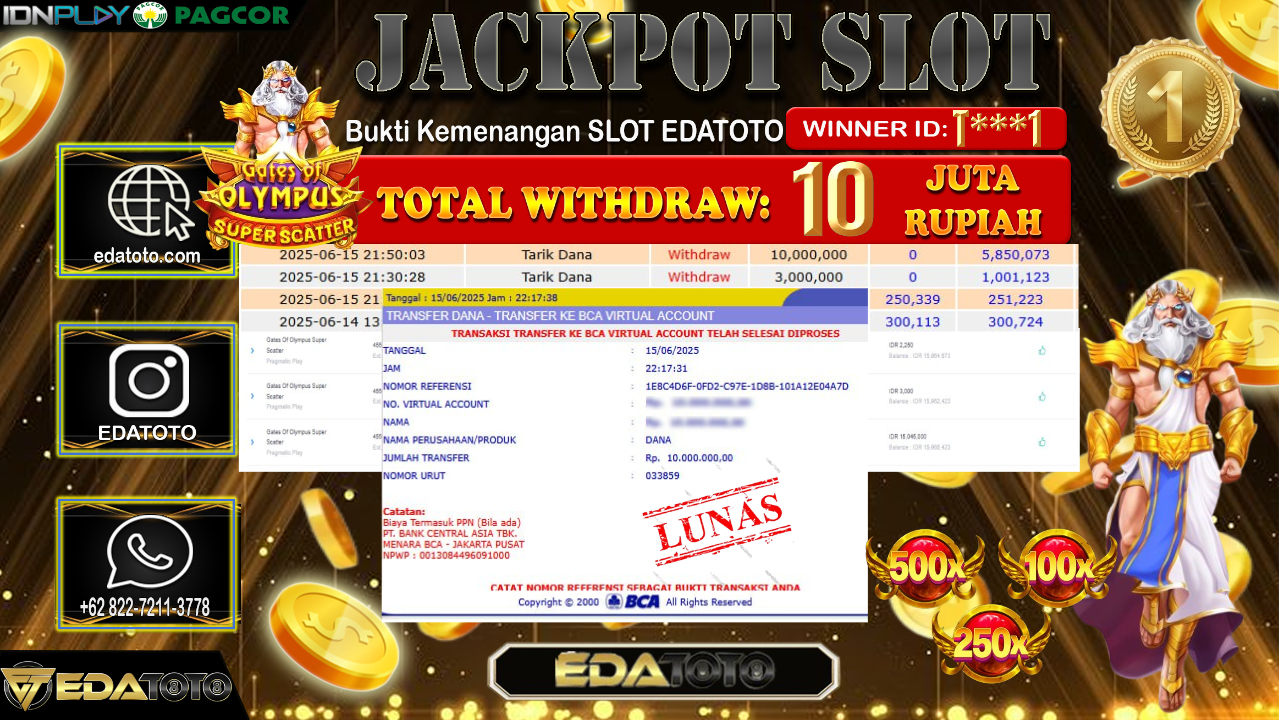 Selamat Kepada Pemilik user ID : T***1 Hari/Tanggal : Senin/ 16, Juni 2025 Jackpot : Rp. 10.000.000 JT Permainan : . . .