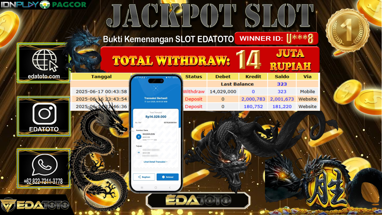 Selamat Kepada Pemilik user ID : U***8 Hari/Tanggal : Selasa/ 17, Juni 2025 Jackpot : Rp. 14.029.000 JT Permainan : . . .