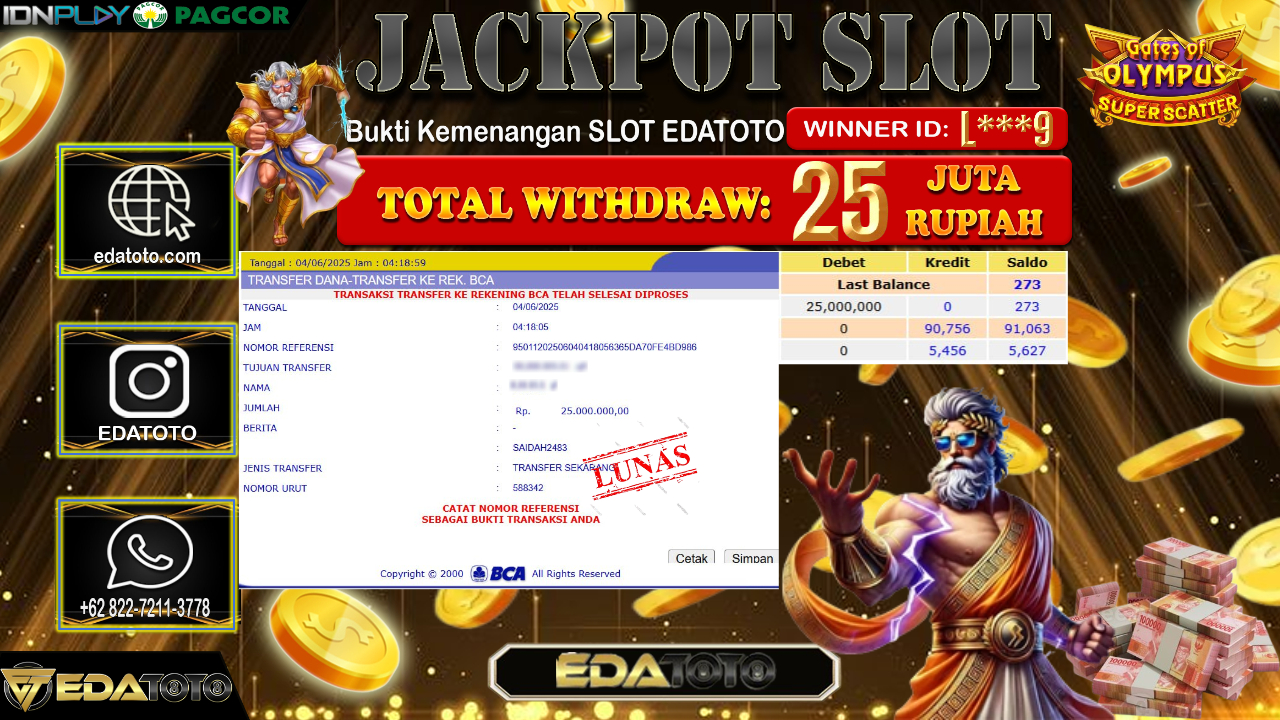 Selamat Kepada Pemilik user ID : L***9 Hari/Tanggal : Rabu/ 04, Juni 2025 Jackpot : Rp. 25.000.000 JT Permainan : Gates . . .