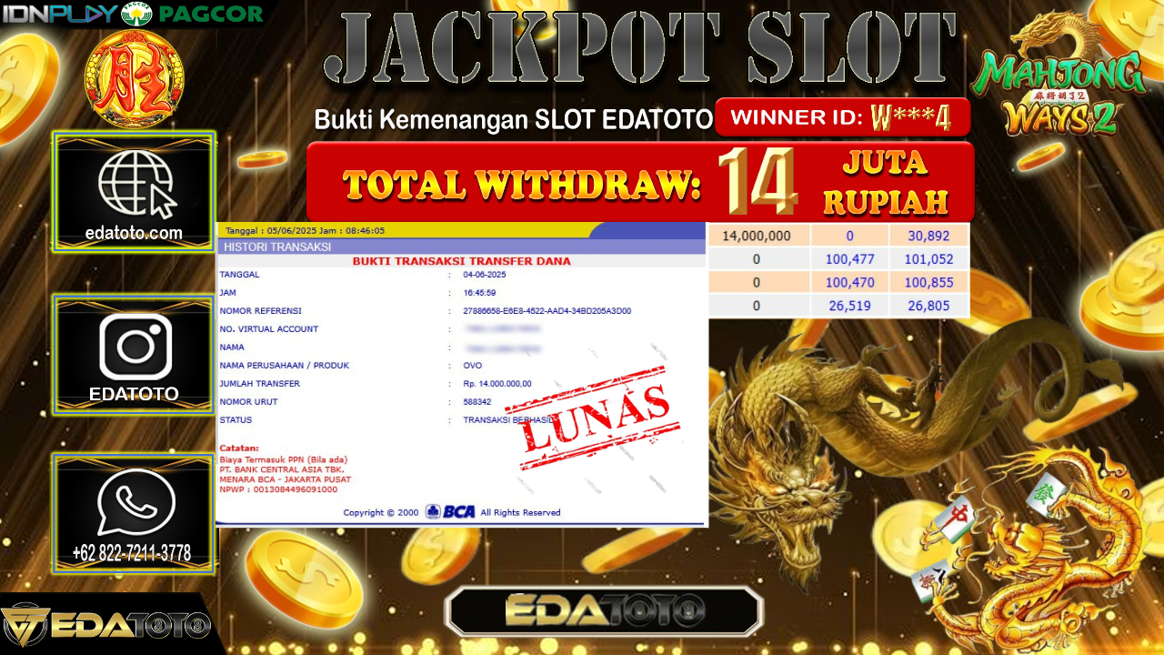 Selamat Kepada Pemilik user ID : W***4 Hari/Tanggal : Kamis/ 05, Juni 2025 Jackpot : Rp. 14.000.000 JT Permainan : Mahjong Ways2 . . .