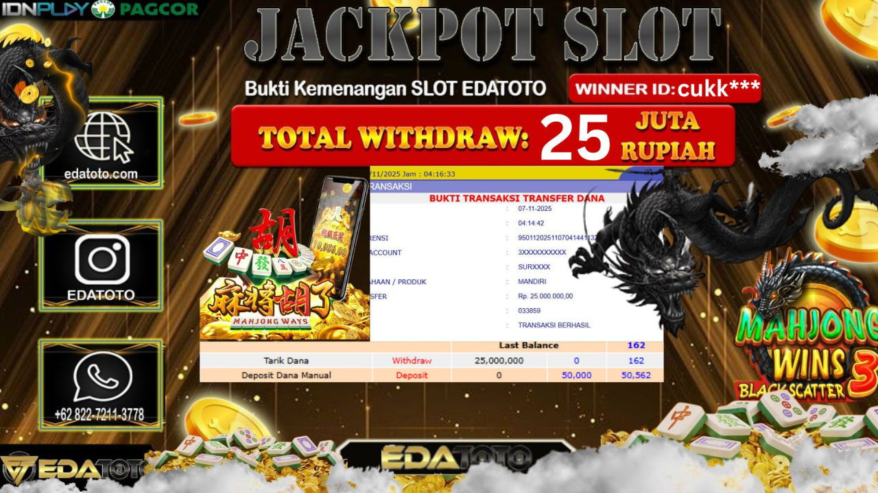 Selamat Kepada Pemilik user ID : cukk** Hari/Tanggal : Sabtu / 8, November 2025 Jackpot : Rp. 25,000,000 JT Withdraw . . .