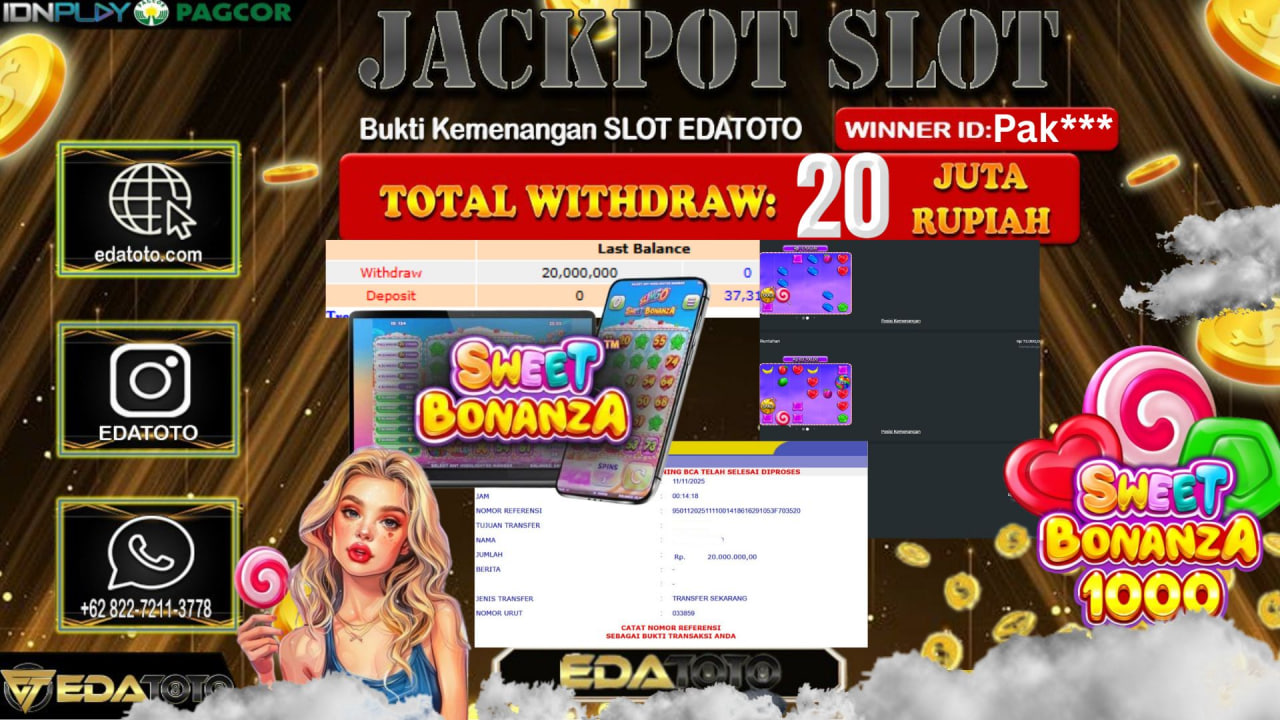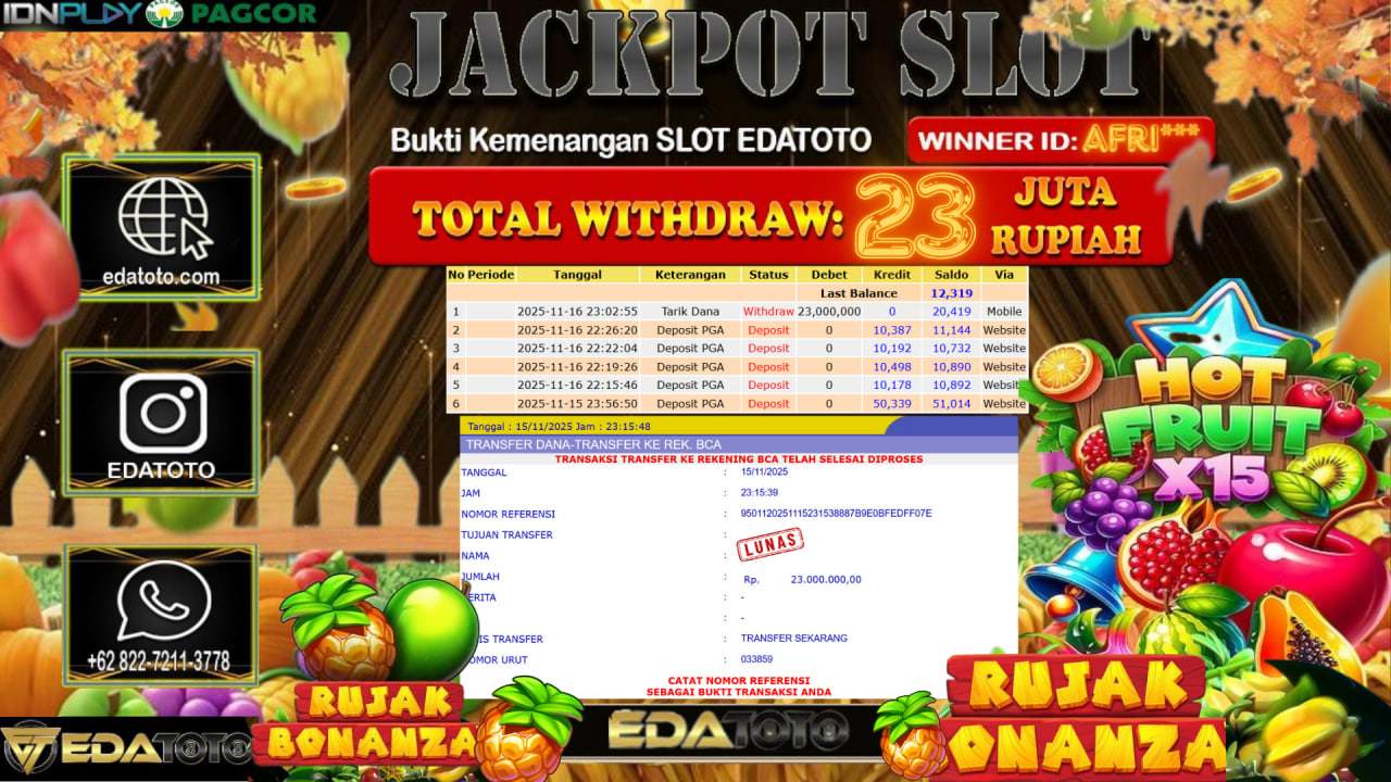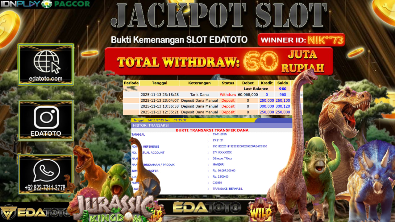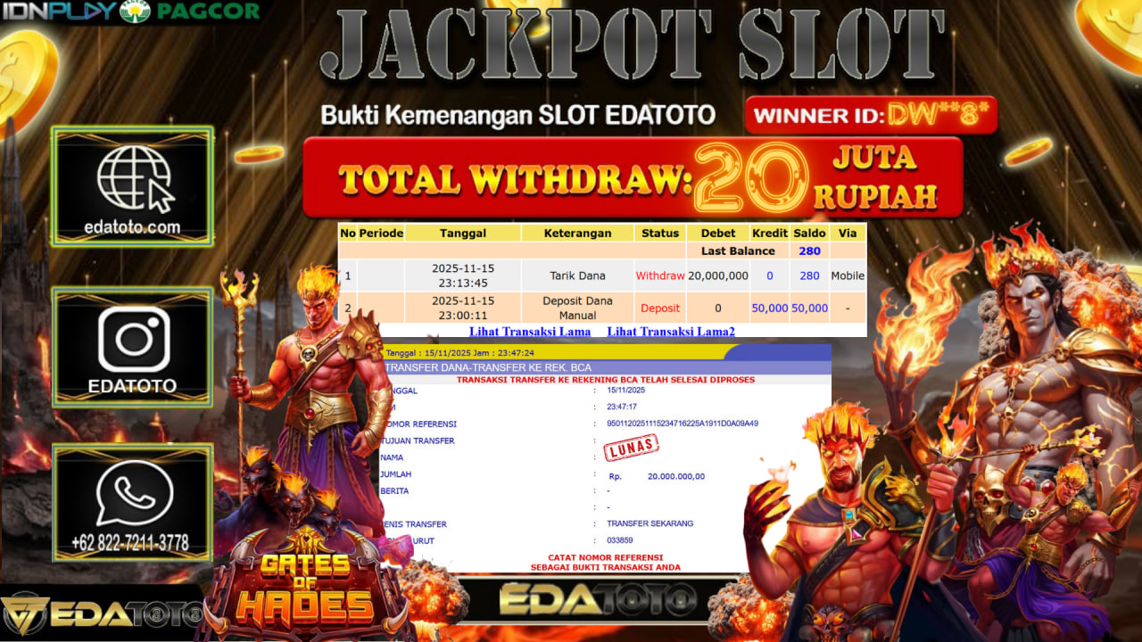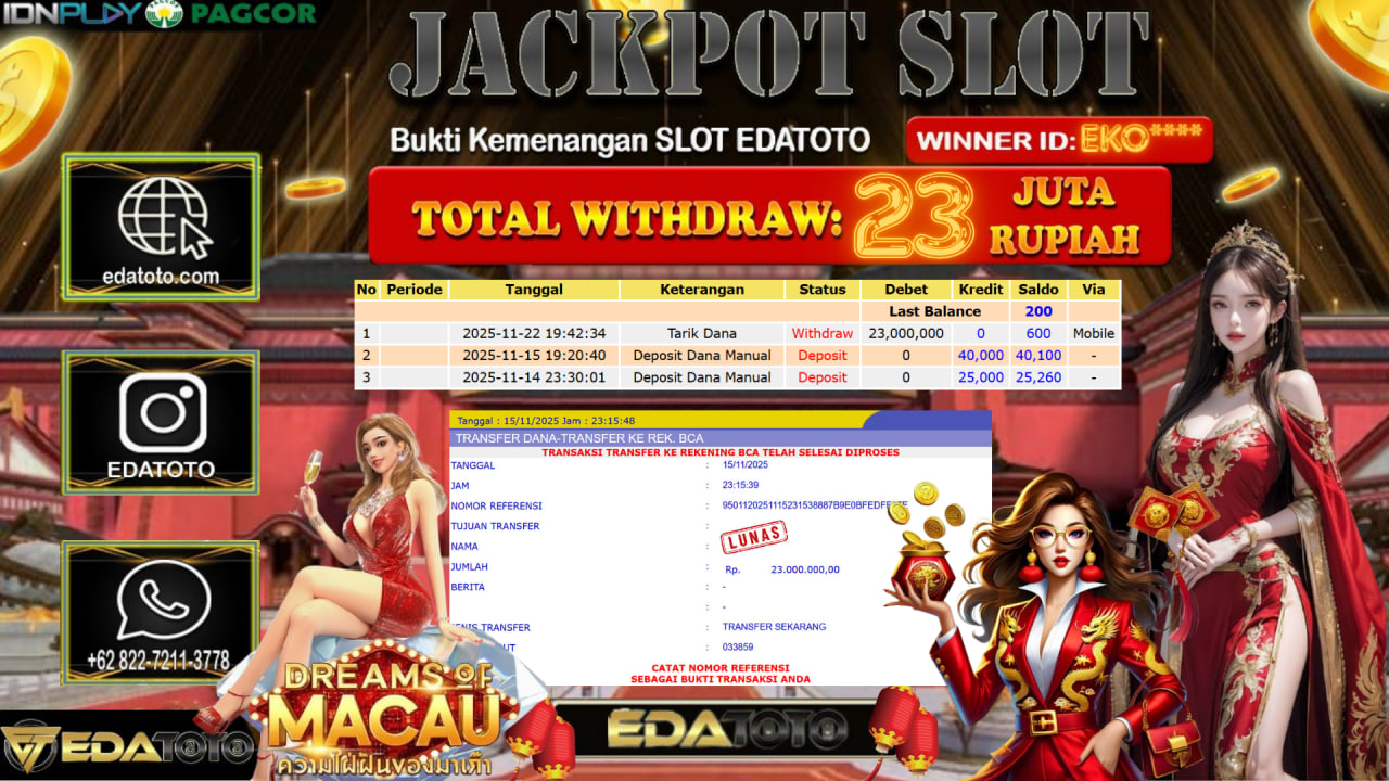 Selamat Kepada Pemilik user ID : EKO**** Hari/Tanggal : Sabtu / 15, November 2025 Jackpot : Rp. 33,120,000 JT Withdraw :23,000,000 . . .