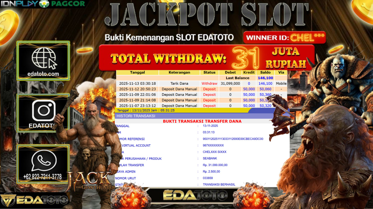 Selamat Kepada Pemilik user ID : CHEL*** Hari/Tanggal : Selasa / 11, November 2025 Jackpot : Rp. 32,800,000 JT Withdraw :31,100,000 . . .