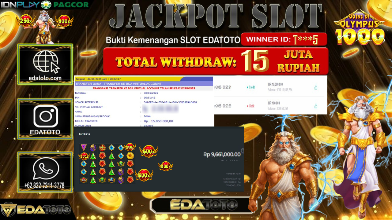 Selamat Kepada Pemilik user ID : T***5 Hari/Tanggal : Jum’at/ 30, Mei 2025 Jackpot : Rp. 15.050.000 JT Permainan : Gates . . .