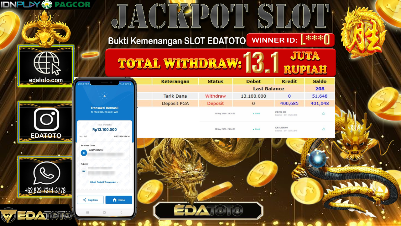Selamat Kepada Pemilik user ID : L***0 Hari/Tanggal : Minggu/ 11, Mei 2025 Jackpot : Rp. 13.100.000 JT Permainan . . .