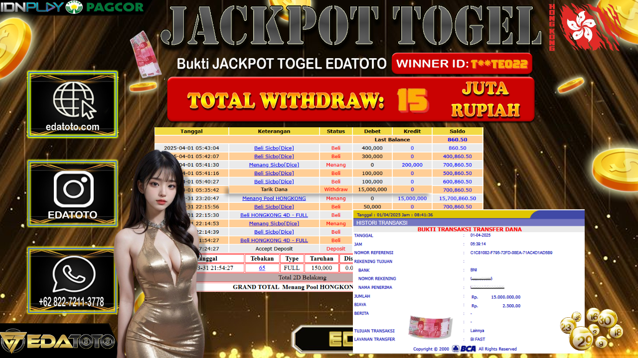 Selamat Kepada Pemilik user ID : T**teo22 Hari/Tanggal : Sabtu / 1 , April 2025 Jackpot : Rp. 15.000.000 JT . . .