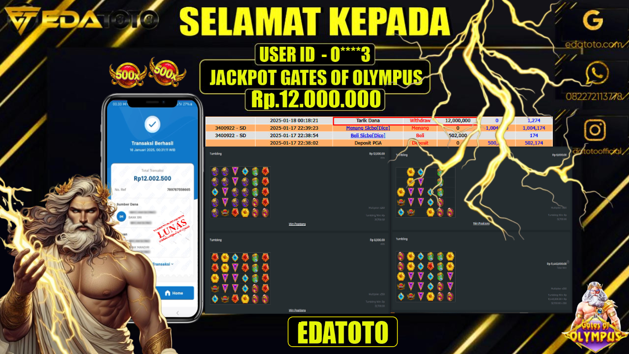 Selamat Kepada Pemilik user ID : JH****R Hari/Tanggal : MINGGU / 12 , JANUARY 2025 Jackpot : Rp. . . .