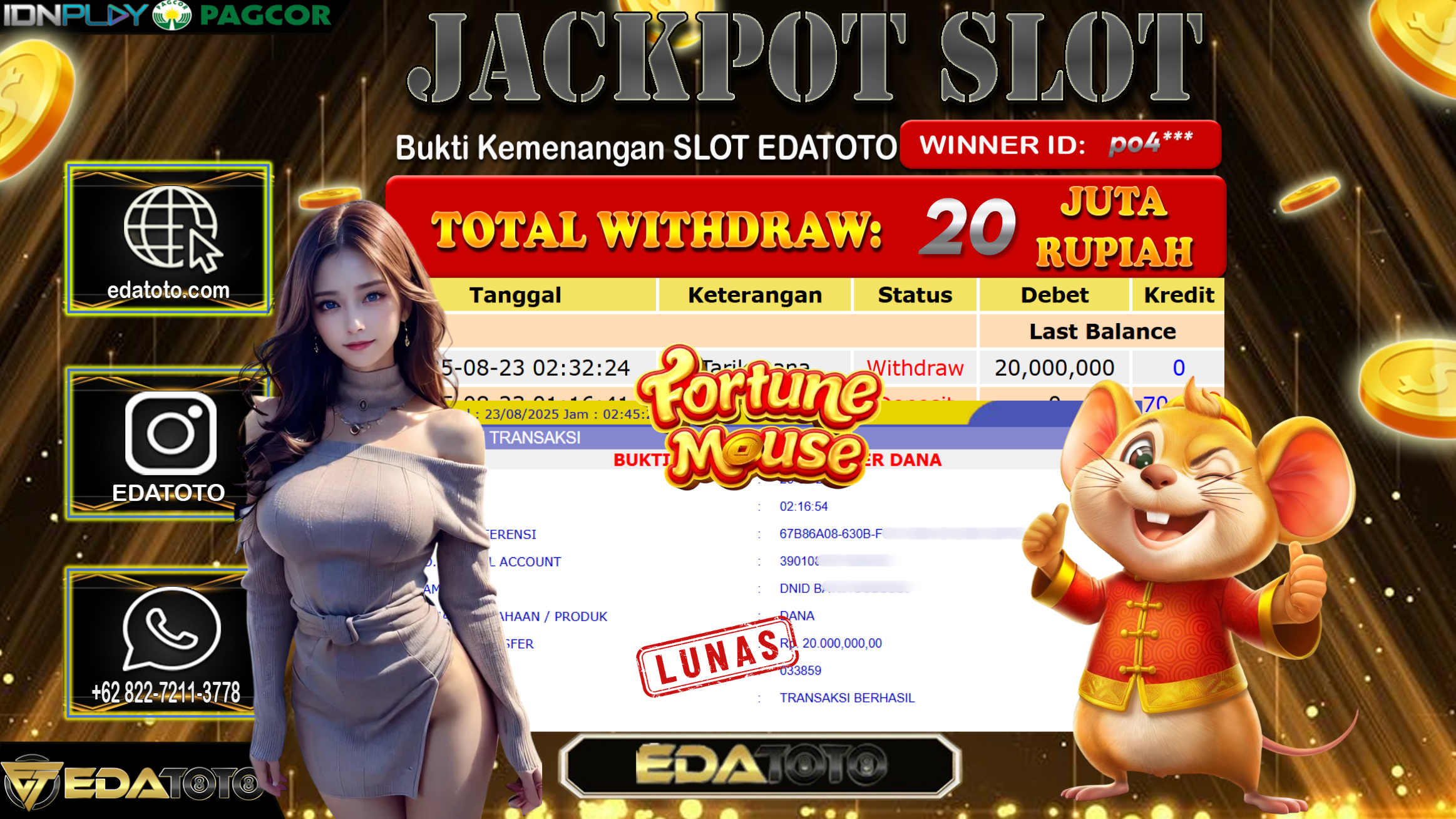 Selamat Kepada Pemilik user ID : po4*** Hari/Tanggal : Minggu/ 24, Agustus 2025 Jackpot : Rp. 20.000.000 JT Permainan : . . .